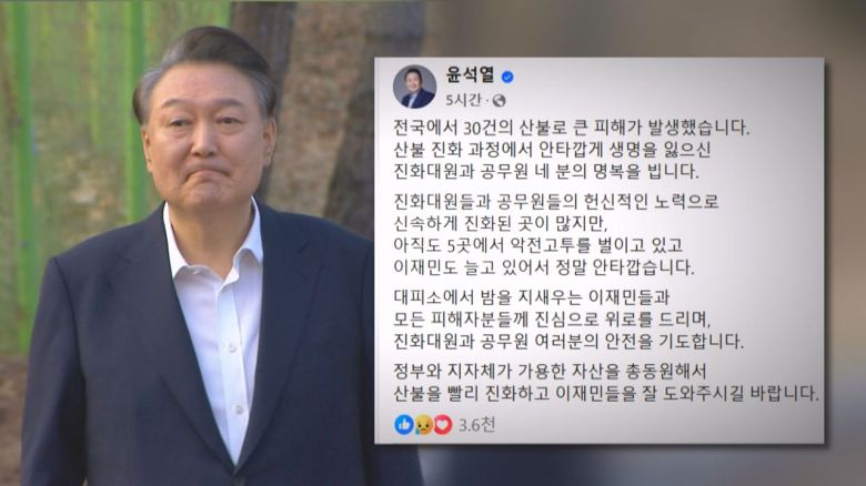 이런 가운데 직무가 정지된 윤석열 대통령은 대형 산불에 대한 메시지를 냈습니다. 야권에선 당장 재난을 부적절하게 활용한다는 비판이 나왔고 여당은 대통령이 아무 말도 안 하는 게 더 이상하다고 반박했습니다.