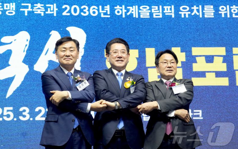 김영록 전라남도지사가 23일 오후 나주종합스포츠파크 다목적홀에서 열린 ‘‘호남권 경제동맹’ 구축 및 ‘2036 전주하계올림픽’ 성공유치를 위한 대혁신호남포럼에서 강기정 광주광역시장, 김관영 전북특별자치도지사와 손을 맞잡고 있다.(독자 제공. 재판매 및 DB금지) 2025.3.23/뉴스1 |