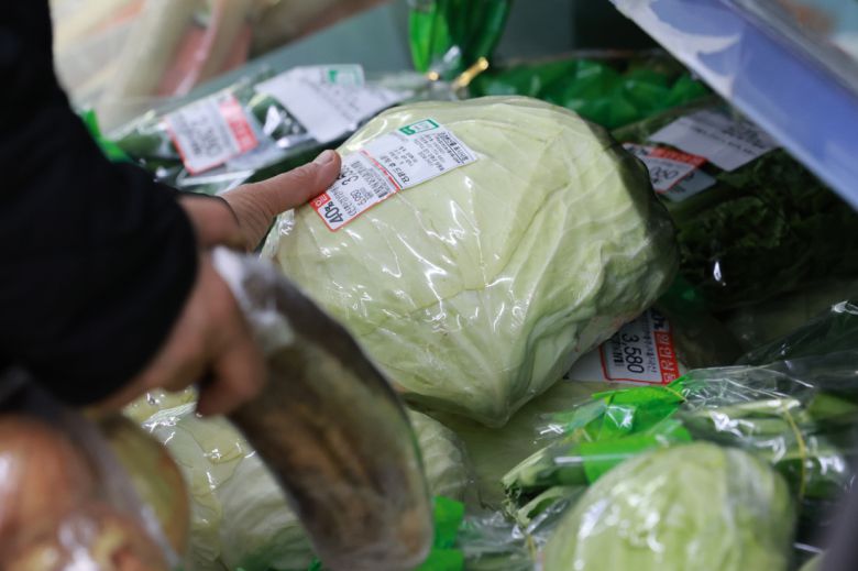 가격에 눈길, 떨이에 손길 서울시내 할인마트의 세일코너에서 23일 한 소비자가 양배추를 살펴보고 있다. 한국농수산식품유통공사에 따르면 이달 양배추 평균 소매가는 6121원으로 배추(5506원)보다 비싸다. 연합뉴스