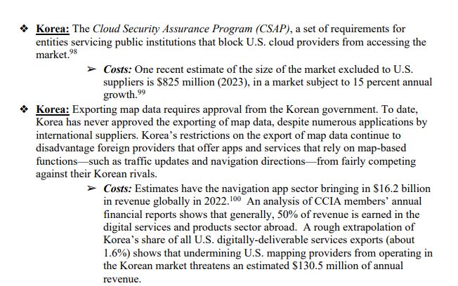 CCIA는 지난 11일(현지시간) 각국의 불공정 무역 관행과 관련해 USTR에 제출한 의견서에서 “한국에서 지도 데이터를 반출하려면 정부의 승인을 받아야 한다”며 “지금까지 여러 글로벌 공급업체들이 신청했지만, 한국 정부는 지도 데이터 반출을 승인한 적이 아예 없다”고 언급했다.