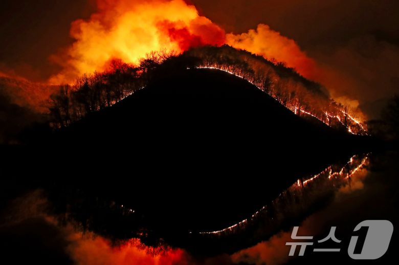 23일 오후 어둠이 짙게 깔린 경북 의성군 의성읍 업리 동사곡지(저수지) 뒤편 야산에 거대한 산불이 확산하고 있다. 2025.3.23/뉴스1 ⓒ News1 공정식 기자