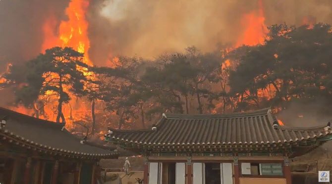 [파이낸셜뉴스] 성묘객의 실화로 발생한 경북 의성 산불로 신라고찰 운람사가 불길에 휩싸인 영상이 공개됐다.
