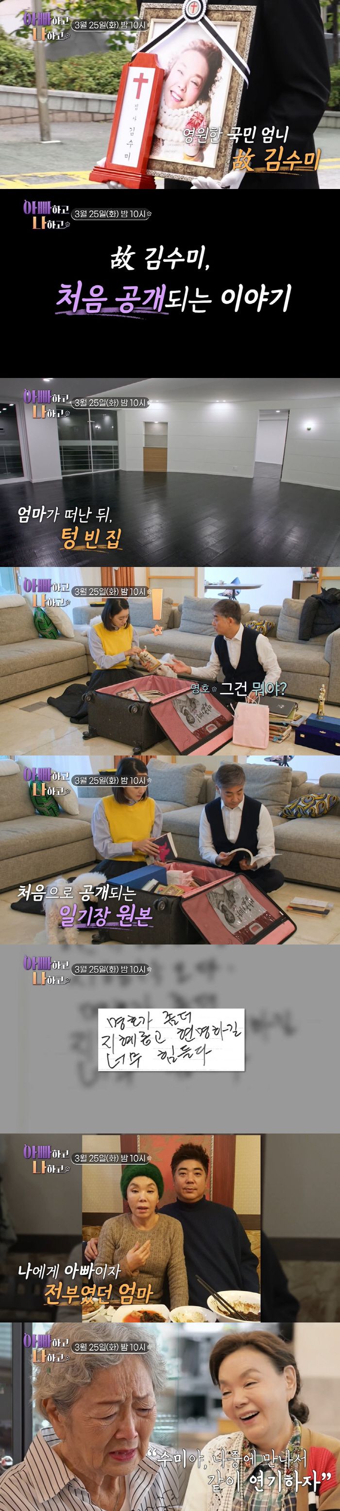 故김수미가 남긴 마지막 재산과 미처 전하지 못한 일기의 내용은 25일 화요일 밤 10시 TV CHOSUN '아빠하고 나하고'에서 방송된다.