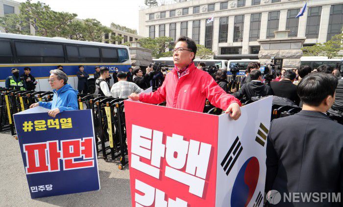 [서울=뉴스핌] 최지환 기자 = 24일 서울 종로구 헌법재판소 앞에서 국민의힘 및 더불어민주당 의원들이 각각 윤석열 대통령 탄핵 반대와 찬성 1인 시위를 하고 있다. 2025.03.24 choipix16@newspim.com
