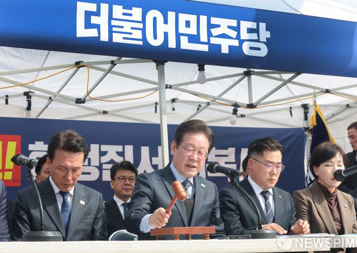 [서울=뉴스핌] 양윤모 기자 = 이재명 더불어민주당 대표가 24일 서울 종로구 광화문 천막당사에서 열린 최고위원회의에 참석해 개회봉을 치고 있다. [공동취재] 2025.03.24 yym58@newspim.com |
