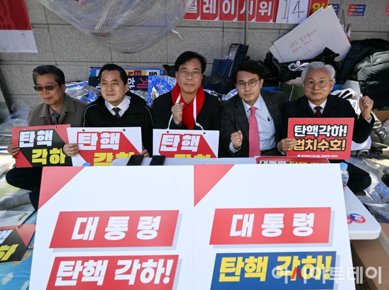 아시아투데이 박성일 기자 = 윤석열 대통령 탄핵심판 선고를 앞둔 24일 서울 종로구 헌법재판소 인근 윤상현 의원(오른쪽에서 두 번째)을 비롯한 국민의힘 의원들이 릴레이시위를 이어가고 있다.
