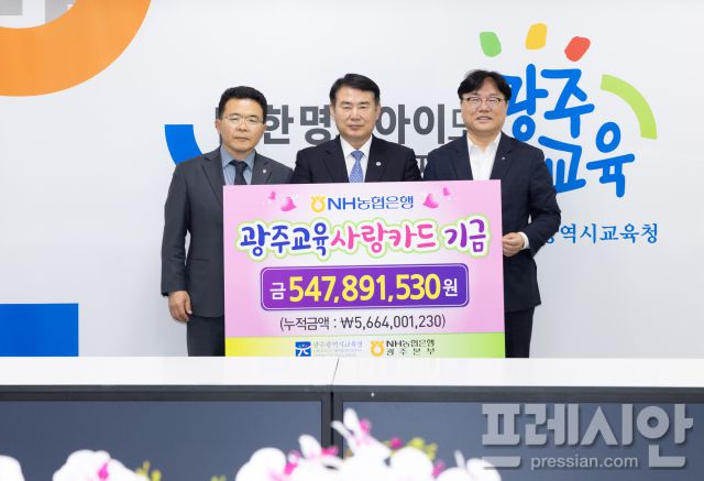 광주시교육청이 NH농협은행 광주본부로부터 ‘광주교육사랑카드’ 사용에 따른 적립금 5억4789만원을 전달받았다. 시교육청은 이 적립금을 학생 복지증진 등 교육사업에 활용할 방침이다.