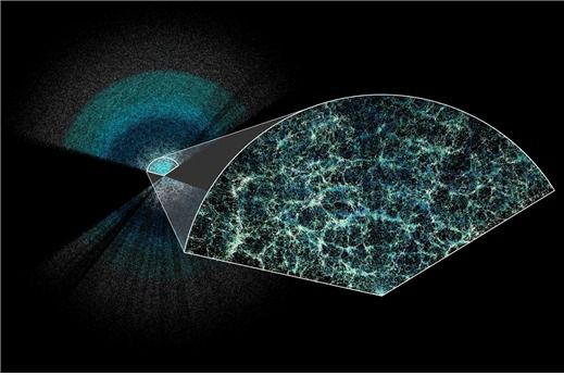 DESI 연구진이 만든 수백만 개의 은하와 퀘이사의 거리와 방향이 찍혀 있는 우주의 3차원 지도. 이 중 적색이동된 약 27억 광년 안쪽의 모습을 확대한 큰 지도에는 중입자음향진동의 패턴인 여러 개의 공 모양이 선명히 보인다.(DESI 출처/한국천문연구원 제공) |