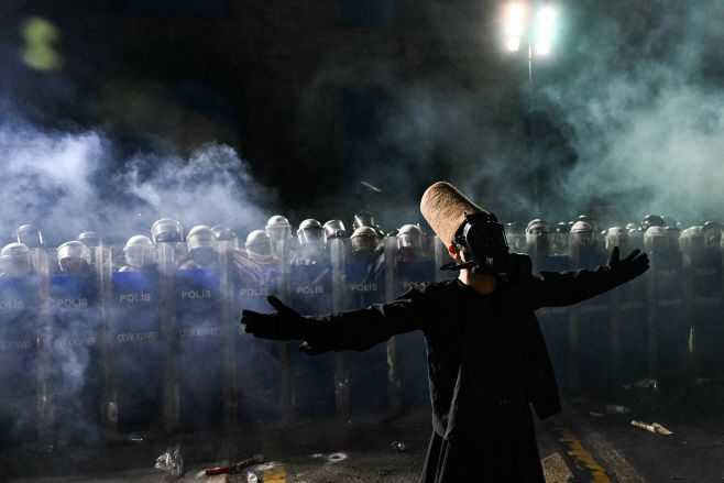 23일(현지시간) 튀르키예 이스탄불 시청 앞에서 에크렘 이마모을루 이스탄불 시장의 구금에 항의하는 시위가 벌어지고 있는 가운데, 시위대 중 한 명이 터키 진압 경찰 앞에 서 있다./AFP 연합뉴스 |