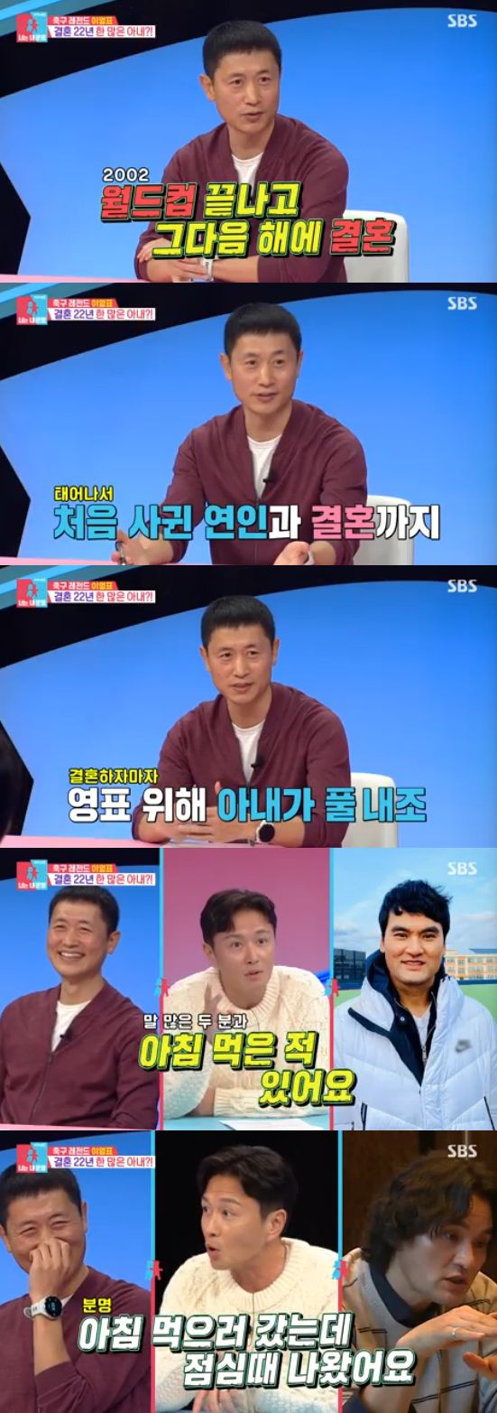 이영표는 "그런데 사랑꾼은 아니다. 제가 운동을 하니까 아내가 결혼을 하자마자 제 내조를 시작했다. 정말 저한테 모든 것을 맞춰줬다"고 말했다.