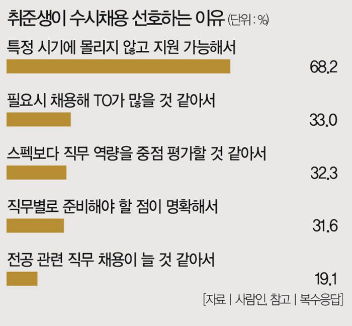 공개채용보다 수시채용을 선호하는 가장 큰 이유는 '특정 시기에 몰리지 않고 지원이 가능해서(68.2%ㆍ복수응답)'였다. 다음으로 '필요시 채용해 TO가 많을 것 같아서(33.0%)' '스펙보다 직무 역량을 중점 평가할 것 같아서(32.3%)' '직무별로 준비해야 할 점이 명확해서(31.6%)' '전공 관련 직무 채용이 늘 것 같아서(19.1%)' 등의 순이었다.