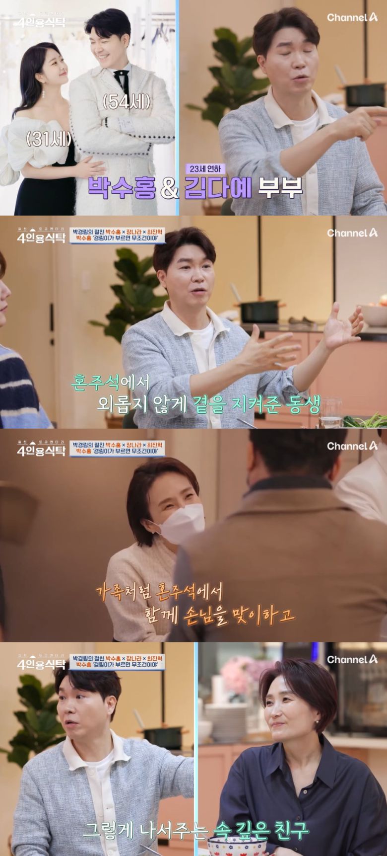 24일 방송한 채널A '절친 토큐멘터리 4인용식탁'에는 박경림과 그의 절친 박수홍, 장나라, 최진혁이 출연했다.
