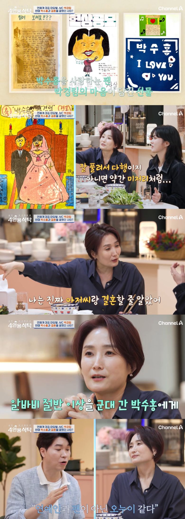 이날 박경림은 "(박수홍은) 내가 팬클럽 회장 출신이다. 92년부터 34년 이어왔다"고 이야기했다. 이에 박수홍은 "박경림이 예전에 나에게 보냈던 편지와 그런 게 있다"며 박경림이 만든 스크랩북을 공개했다.