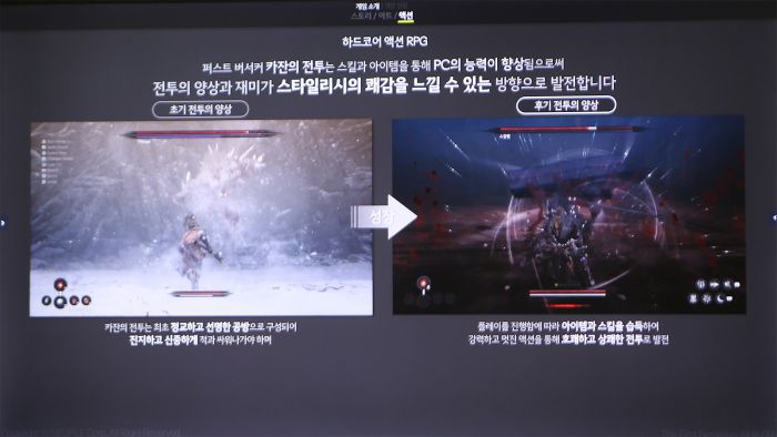 게임 초반에 카잔은 폐인이 된 상태다. 이때 카잔이 강력한 모습을 보여준다면 이어지는 이야기에 유저들이 공감하기 어려웠을 것이다. 그래서 초반에는 치열한 전투를 보여주는 데 집중했다. 이후 카잔이 점점 성장하면서 그에 어울리는 전투를 선보이고, 그 성장을 플레이어도 체감할 수 있도록 만드는 데 신경을 많이 썼다.