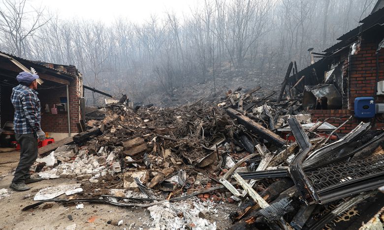 경북 의성군 산불 발생 나흘째인 25일 의성군 옥산면 감계리에서 한 주민이 산불로 무너진 주택을 살펴보고 있다. 연합뉴스 |