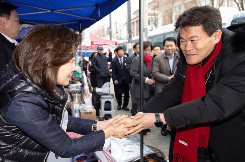 한국사 강사 전한길씨가 24일 오전 서울 종로구 헌법재판소 앞에서 윤석열 대통령 탄핵 각하 촉구 릴레이 시위에 나선 나경원 의원과 악수하고 있다. 뉴스1 |