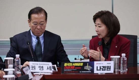 권영세 국민의힘 비상대책위원장과 나경원 의원이 25일 국회 의원회관에서 열린 '중국의 서해공정 긴급대응 국회토론회'에서 대화하고 있다.
