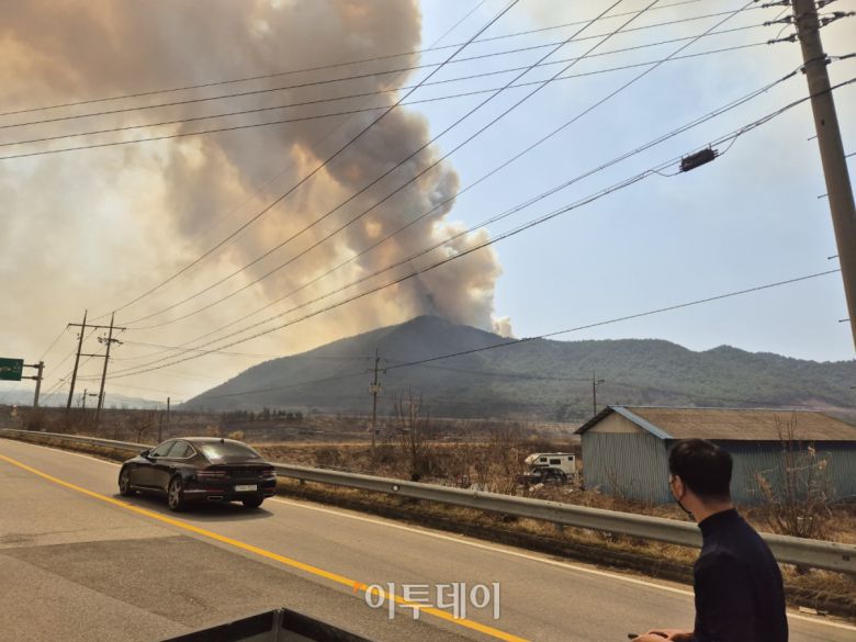 24일 경상북도 의성군 점곡면 윤암리 일대에 산불로 연기가 자욱하게 일고 있다. |