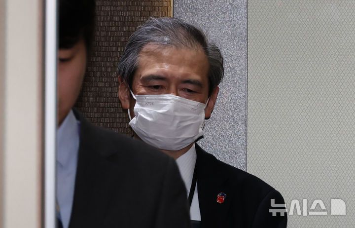 [서울=뉴시스] 김명원 기자 = 일본 사회과 교과서 상당수에 독도가 일본 고유 영토라는 억지 주장이 담긴 내용이 발표된 가운데 미바에 다이스케 주한 일본대사관 총괄공사가 25일 서울 종로구 외교부에 초치되어 들어서며 엘리베이터에 오르고 있다. 2025.03.25. kmx1105@newsis.com