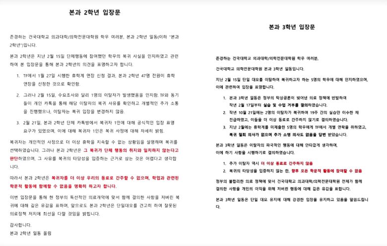 학업에 복귀한 동료를 향해 경고하는 건국대 의대생들의 입장문