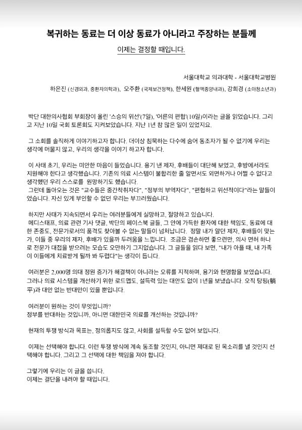 “우리는 여러분들에게 실망하고, 절망하고 있습니다. 메디스태프, 의료 관련 기사 댓글, 박단의 페이스북 글들, 그 안에 가득한 환자에 대한 책임도, 동료에 대한 존중도, 전문가로서의 품격도 찾아볼 수 없는 말들이 넘쳐납니다. 정말 내가 알던 제자, 후배들이 맞는가, 이들 중 우리의 제자, 후배가 있을까 두려움을 느낍니다. 의사 면허 하나로 전문가 대접을 받으려는 모습도 오만하기 그지없습니다. 현재의 투쟁 방식과 목표는, 정의롭지도 않고, 사회를 설득할 수도 없어 보입니다.”