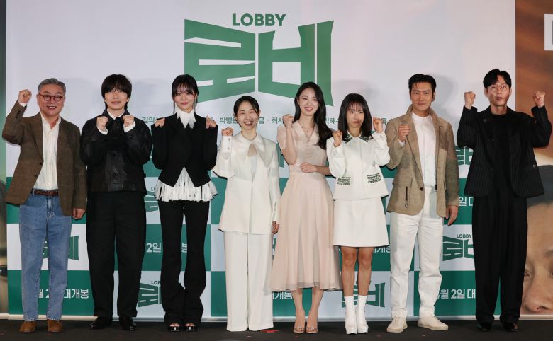 25일 서울 CGV 아이파크몰점에서 열린 영화 ‘로비’ 시사 간담회에서 배우 김의성(왼쪽부터), 이동휘, 차주영, 강말금, 강해림, 곽선영, 최시원, 박병은이 포즈를 취하고 있다. 감독이자 주연 하정우는 이날 맹장염으로 불참했다.