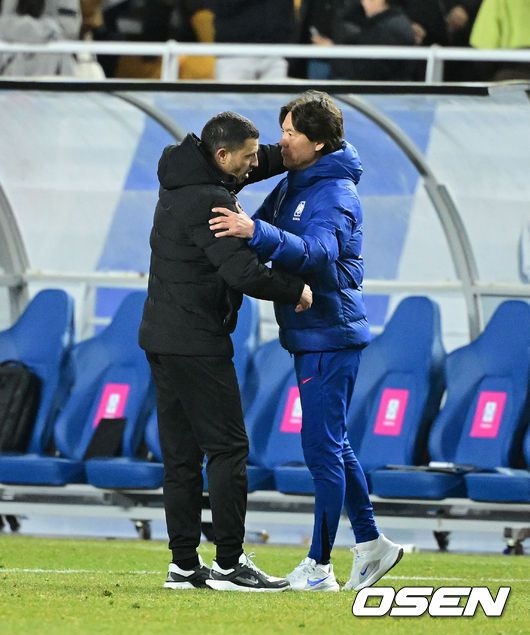 경기를 마치고 요르단 자말 셀라미 감독과 대한민국 홍명보 감독이 인사를 나누고 있다. 2025.03.25 / jpnews@osen.co.kr