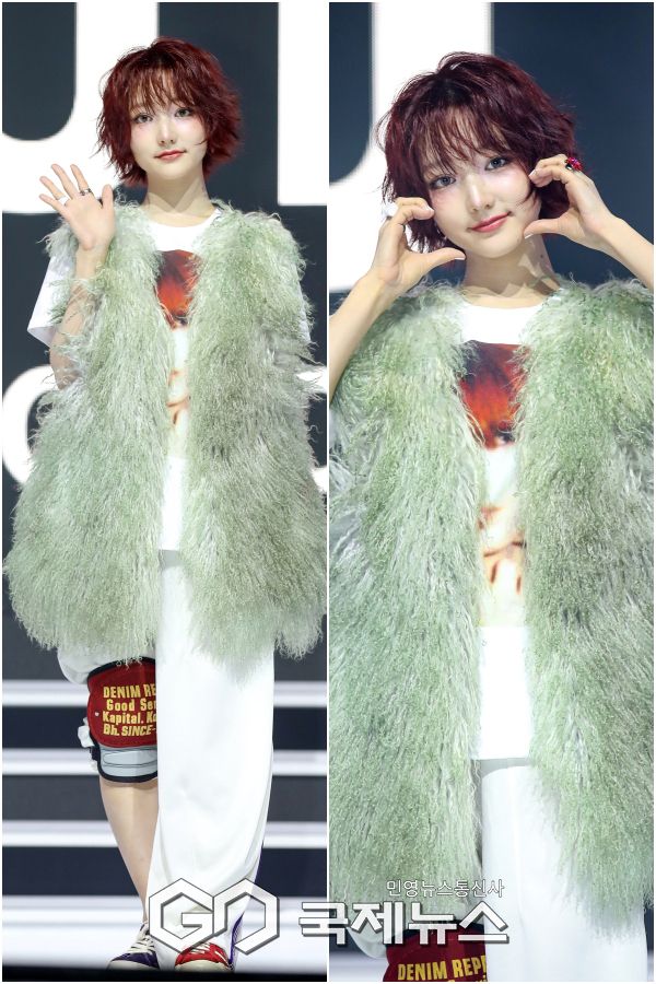 (서울=국제뉴스) 이대웅 기자 = 그룹 키키(KiiiKiii) 지유가 24일 오후 서울 용산구 한남동 블루스퀘어 마스터카드홀에서 열린 데뷔 앨범이자 첫 미니앨범 '언컷 젬(UNCUT GEM)' 발매기념 쇼케이스에 참석해 포토타임을 갖고 있다.