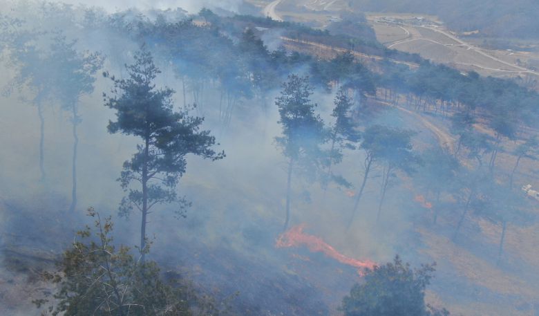 ▲ 25일 경북 의성군 옥산면 당진영덕고속도로 인근 신계리 일대에서 연기가 피어오르고 있다.