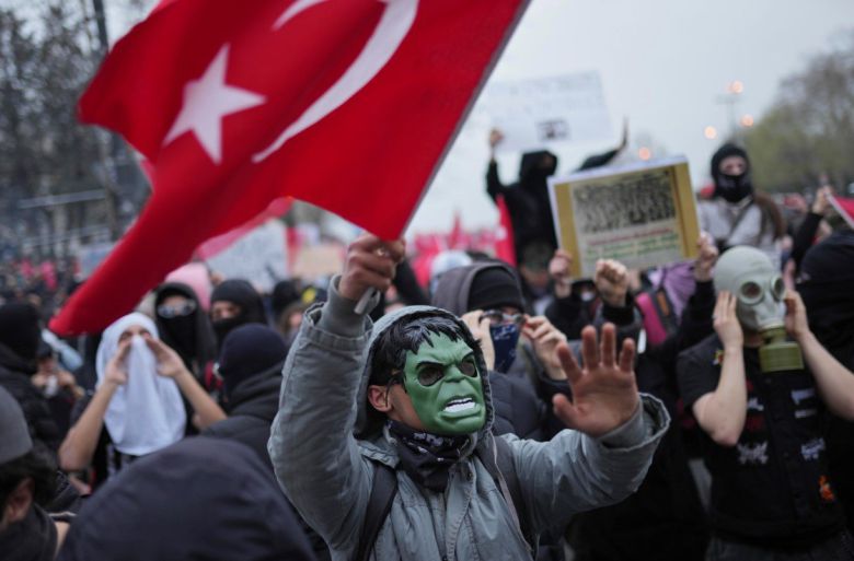 3월 23일 일요일 이스탄불에서 야당 정치인 이마모을루 체포에 항의하는 시위대가 국기를 흔들고 있다. 시위대는 경찰이 뿌리는 최루가스를 피하기 위해 마스크와 가면, 방독면 등을 썼다. AP 뉴시스