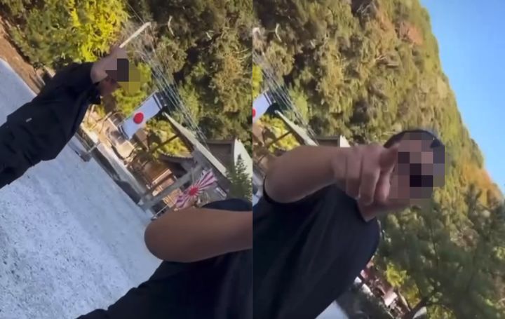 [서울=뉴시스] 불법 주차를 제지하는 직원에게 경상도 사투리를 쓰는 한국인이 "안 가, 이XX야"라며 욕설을 퍼붓고 있다. 뒤에는 일장기와 욱일기. (사진=와타즈미 신사 페이스북) 2025.03.26. photo@newsis.com *재판매 및 DB 금지 |