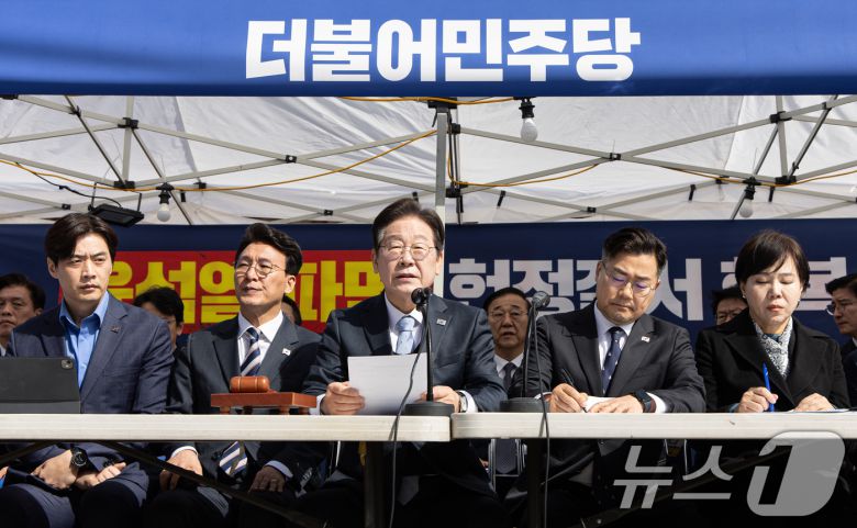 이재명 대표는 이날 오전 서울 종로구 광화문 인근 천막당사에서 열린 최고위원회의에서 "하루라도 빨리 혼란을 종식해야 할 헌재가 국민을 납득시킬 이유도 없이 계속 (선고를) 미루는 것은 그 자체가 헌정질서에 대한 위협이 아니겠냐"고 비판했다.