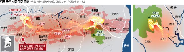 이 중 가장 피해가 큰 곳은 의성·안동으로 이날 기준 3만 7000㏊의 산림이 거센 산불 피해 영향권에 있는 것으로 파악됐다. 불길은 이날 오후 9시 직선거리 기준으로 유네스코 세계문화유산인 안동 하회마을 앞 4㎞, 병산서원 앞 2㎞ 지점까지 접근했다.
