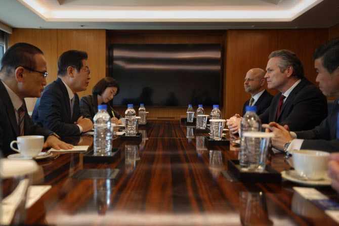 [이데일리 한광범 기자] 이재명 더불어민주당 대표가 26일 마이클 던리비 미국 알래스카 주지사를 만나 액화천연가스(LNG) 개발 등 에너지 사업 협력 방안을 논의했다.
