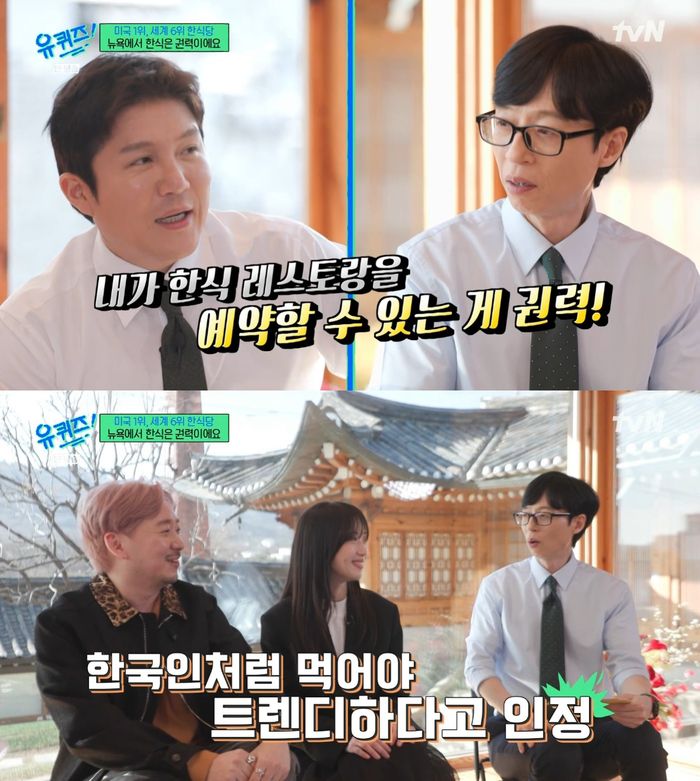 이날 유재석은 “미국에서 한식은 되게 힙하고 한식을 모르면 촌스러운 느낌이라는데. 정말 추세가 그러냐”고 물었다. 박정은 대표는 “10년 전 뉴욕은 성게알, 초밥을 이야기했을 때 내가 트렌디하다고 말했는데 요즘은 내가 한식 레스토랑을 예약할 수 있다면 그게 권력이다”라고 말했다. 유재석은 “그 정도냐”고 놀랐다.