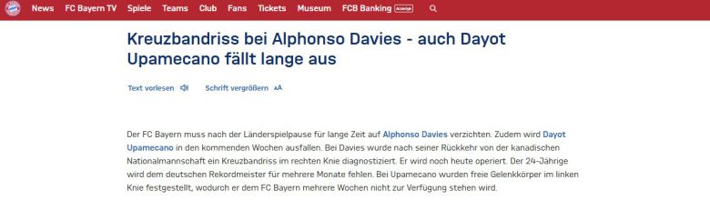 이어 "데이비스는 캐나다 국가대표팀 경기 후 복귀했다. 검진 결과 오른쪽 무릎 십자인대 파열이 확인됐다, 그는 오늘 수술 받을 예정이다"라며 "우파메카노는 몇 주 동안 경기 출전이 불가능하다"라고 설명했다.