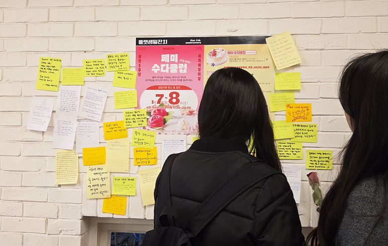 경향신문 여성 서사 아카이브 플랫팀 5주년을 기념해 열린 생일 카페에서 지난 7일 방문객들이 포스트잇 방명록을 보고 있다. 김서영 기자 |