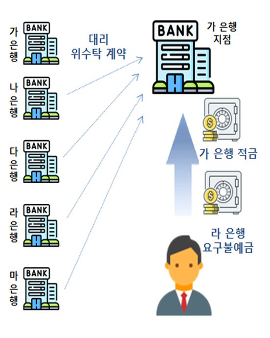 #수도권에 거주하는 B씨는 얼마 전 집 근처 주거래 은행(C은행) 영업점이 폐쇄돼 은행거래에 불편을 겪고 있었다. 그러나 은행대리업 도입으로 C은행이 집 근처 D은행 영업점과 은행대리업 계약을 체결하자 D은행에서 C은행 서비스를 이용할 수 있게 돼 편리해졌다.