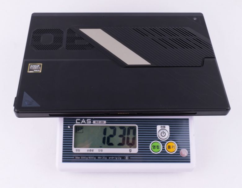 실제로 측정한 본체 무게는 1.23kg이다. 키보드를 포함하면 약 1.62kg이고 100W 어댑터를 포함하면 약 2kg, 200W 어댑터를 포함하면 약 2.18kg이다.