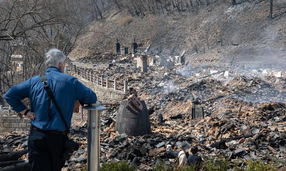 26일 경북 의성군 고운사에 산불로 전소된 건물 흔적들이 보이고 있다. 이번 경북 의성 산불로 국가지정 문화유산 보물로 지정된 고운사 가운루와 연수전 등이 전소됐다. 뉴스1