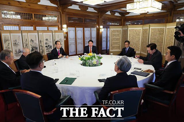 [더팩트ㅣ임영무 기자] 한덕수 대통령 권한대행 국무총리(왼쪽 세 번째)가 27일 오후 서울 종로구 총리공관에서 열린 경제6단체 간담회에 참석해 발언을 하고 있다.