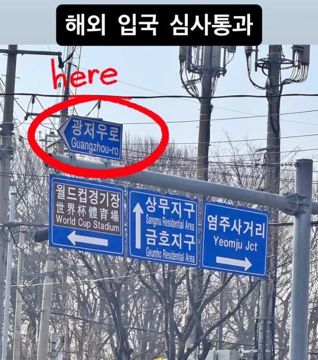 프로축구단 포항 스틸러스의 한 팬이 22일 광주에서 열린 광주FC와 포항 스틸러스의 경기를 관람하기 위해 광주로 응원을 가면서 사회관계망서비스(SNS)에 올린 사진. 광주시와 중국 광저우시 간 자매결연을 기념하기 위해 지정한 도로명인 '광저우로' 표지판 위치에 붉은색 원을 그린 뒤 '해외 입국심사 통과'라는 문구를 삽입해 '광주 비하' 논란이 일었다. 인스타그램 캡처 |