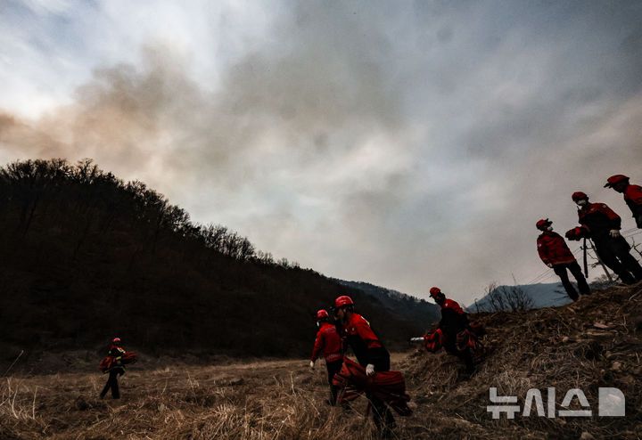[안동=뉴시스] 김금보 기자 = 27일 경북 안동시 원호리 일직면 일대에서 산림청 진화대원들이 산불 진화 작업에 나서고 있다. 2025.03.27. kgb@newsis.com |