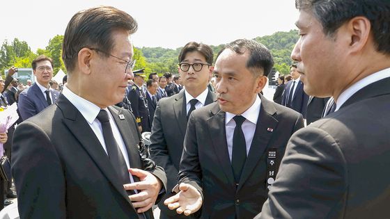 더불어민주당 이재명 대표가 2023년 6월 서울 동작구 국립서울현충원에서 열린 제68회 현충일 추념식장에서 최원일 전 천안함장(가운데)으로부터 항의를 받고 있다. 대통령실사진기자단
