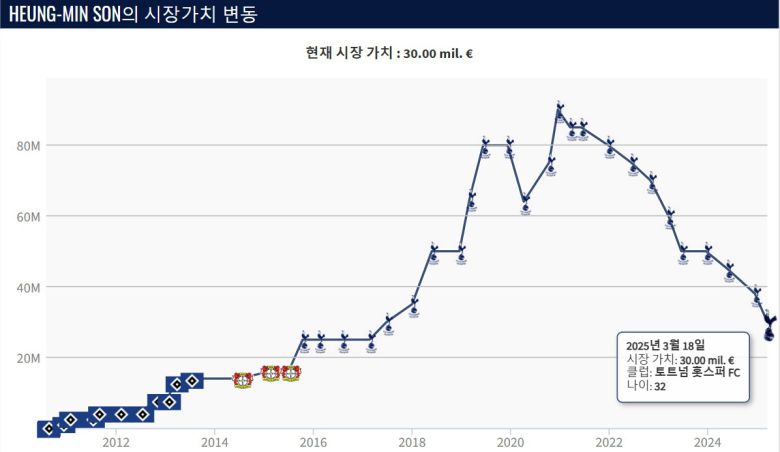 독일 축구 이적시장 전문 사이트 '트란스퍼마르크트'에 따르면 현재 손흥민 추정 몸값은 3000만 유로(약 473억원)이다. 지난해 12월까지 추정 몸값은 3800만 유로(약 600억원)였다. 약 3개월 만에 급락했다.