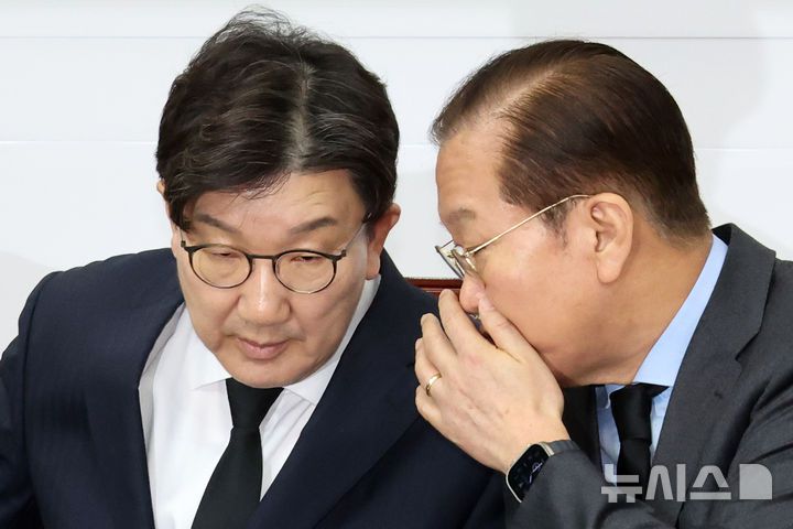[서울=뉴시스] 조성우 기자 = 권영세(오른쪽) 국민의힘 비상대책위원장과 권성동 원내대표가 27일 오전 서울 여의도 국회에서 열린 산불재난대응 특별위원회 긴급회의에서 대화하고 있다. 2025.03.27. xconfind@newsis.com