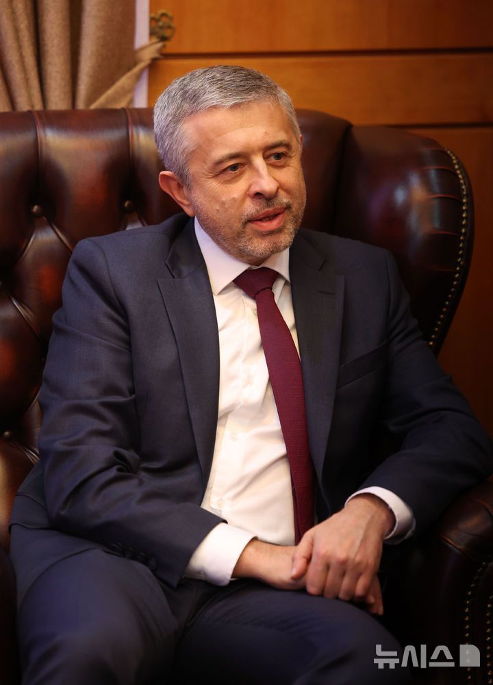 [서울=뉴시스] 김선웅 기자 = 게오르기 지노비예프 주한 러시아 대사가 26일 서울 중구 주한 러시아 대사관에서 뉴시스와 인터뷰를 하고 있다. 2025.03.28. mangusta@newsis.com