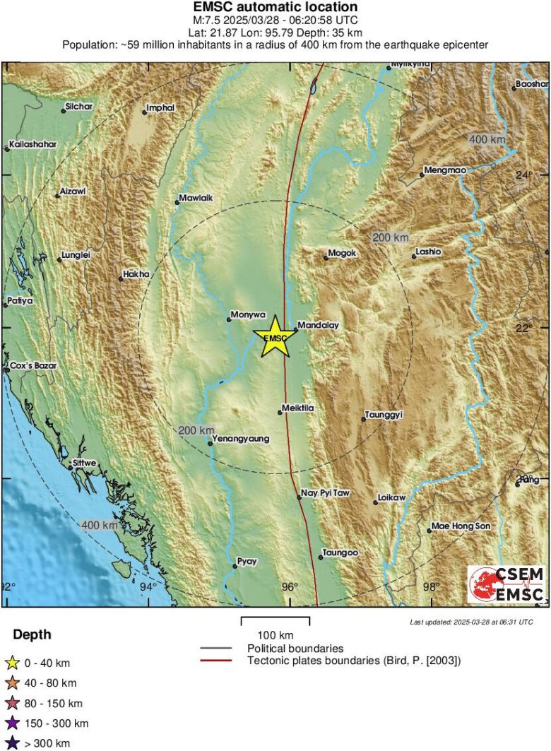 미얀마 내륙에서 현지시간으로 오늘(28일) 낮 12시 50분쯤 규모 7.7의 강진이 발생했다고 유럽지중해지진센터(EMSC)가 밝혔습니다.