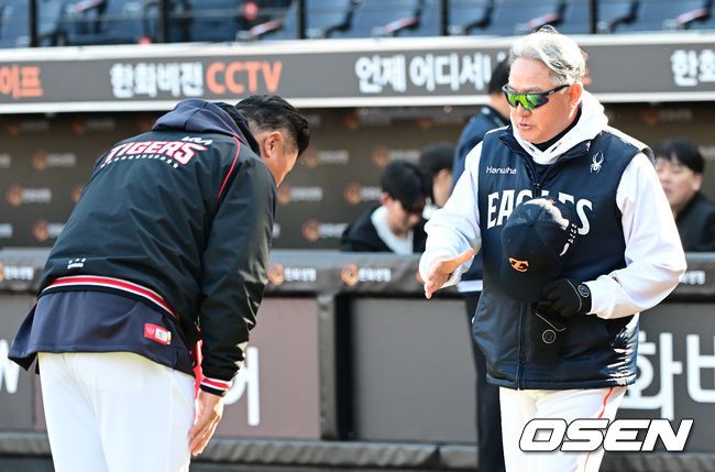 경기를 앞두고 한화 김경문 감독과 KIA 이범호 감독이 인사를 나누고 있다. 2025.03.28 / dreamer@osen.co.kr