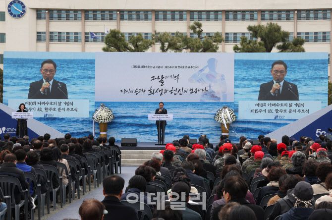 [이데일리 김태형 기자] 조성명 강남구청장이 28일 수도전기공업고등학교에서 열린 제10회 서해수호의 날 기념식과 제15주기 故 한주호 준위 추모식에서 추모사를 하고 있다.